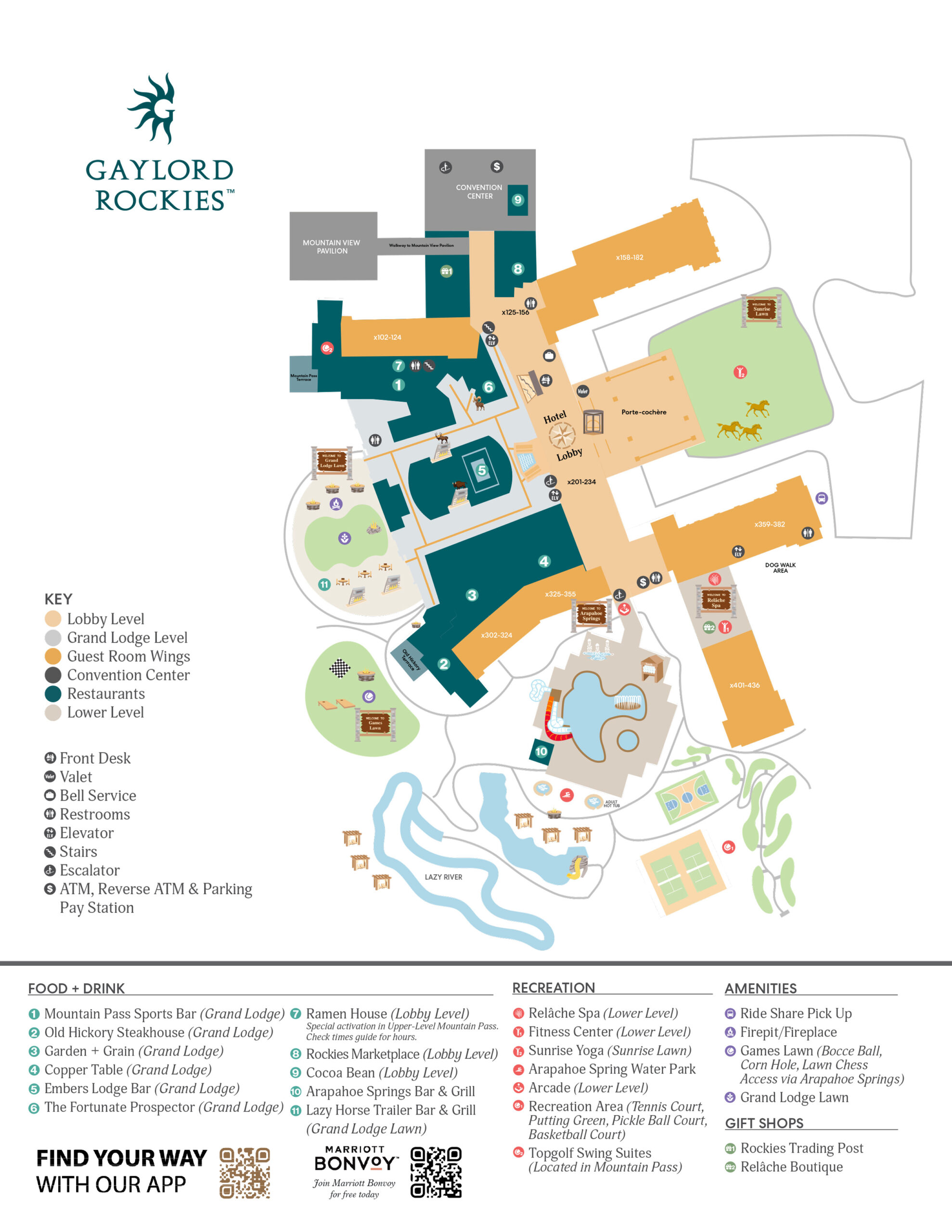 Three-acre aquatic paradise includes indoor and heated outdoor pools, thrilling waterslides, a 720-foot-long lazy river with bubblers and a rocky grotto, sunbathing decks, and private cabanas with stunning views of the Rocky Mountains.